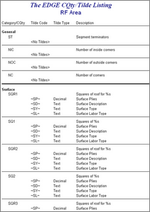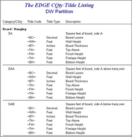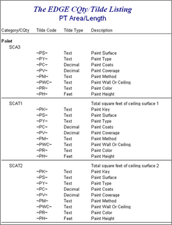 The Tilde Listing report provides the user with a complete listing of all the Tilde codes being used in a selected condition. The purpose of the report is not to provide quantities, units, prices as such. its purpose is to provide a list of all the Tilde codes. The report displays the C(Condition)/Qty, the Tilde Code, a Tilde Type and a Description. We have selected one example from the different trades to give you clearer picture of the tildes codes.