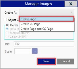 - Select the images (sheets) to use for takeoff. When the Manage Images dialog box appears, choose an option from CREATE AS. For this example, choose PAGE.