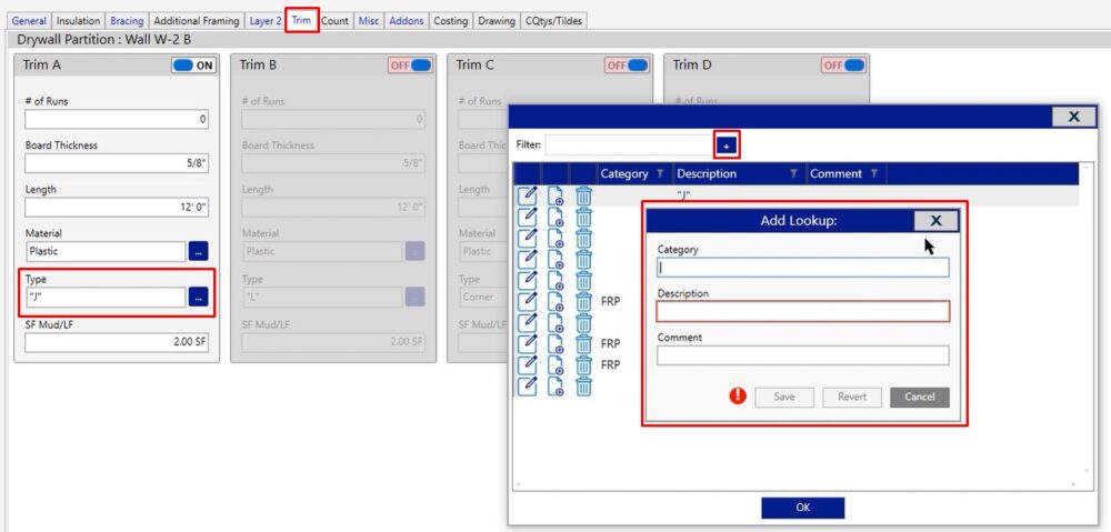 Trim A, B, C, and D, are the same, but ultimately choose whatever one you may need for this project. Turn that one on and the other one off. Or if you needed to have two different trim pieces, feel free to turn both of them on. As you measure in the take off screen, whatever is turned on here will be calculated for you.