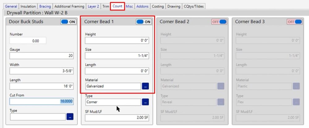 Inside of your partition condition, you do have the capability to count corner bead as well as door buck studs. Realistically, it’s up to you whether you want to use the count tab inside of the drywall partition condition. You can measure it separately if you would like.