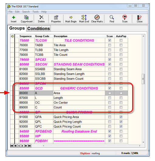 Pictured above is the opening screen for the Roofing Group database, obviously if you are not a roofer your screen will be different everybody should have four Generic (Area, Length, On-Center and Count) Conditions with their system.