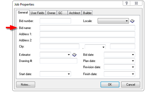 ·This opens the Job Properties dialog screens, there are a total of six tabs where you can enter as much information about an estimate as you wish to. Only one field the Bid Name field is a required field to be filled in for obvious reason. The remainder are optional and are not required in order to estimate.