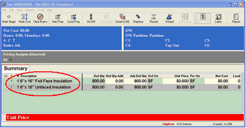 Next, click Finished. This fixes one of the two error, you would repeat steps 1 through 5 and fix the other Insulation Type error. You can only make one fix at a time. After clicking Finish you are returned to the Pricing Screen. Notice that the three separate lines of Insulation have been reduced to one all have the correct Description and the repeat factor is now 5 as it should be.